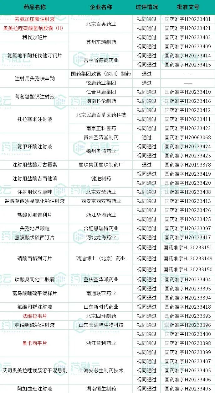 过评品种中,去氨加压素注射液、奥美拉唑碳酸氢钠胶囊(II)、法维拉韦片和奥卡西平片等4个品种迎来国内首家过评;氨氯地平阿托伐他汀钙片、注射用头孢呋辛钠、葡萄糖酸钙注射液、托拉塞米注射液和氨甲环酸注射液等5个品种均有2家药企最新通过一致性评价。