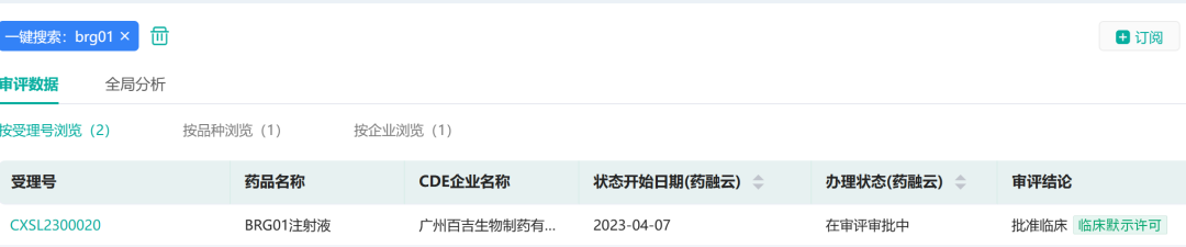 2023年04月07日,据药融云数据库显示,广州百吉生物制药有限公司全球独家首创的重定向CAR-T细胞疗法新药BRG01注射液临床试验(IND)正式获得国家药品监督管理局药品审评中心(CDE)的临床试验默示许可。拟用于治疗复发/难治性EBV阳性淋巴瘤。