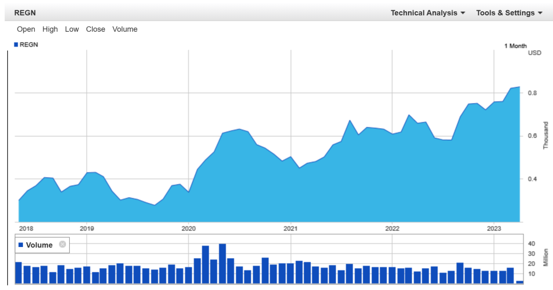 再生元目前市值90亿美元,近5年涨幅超150%。