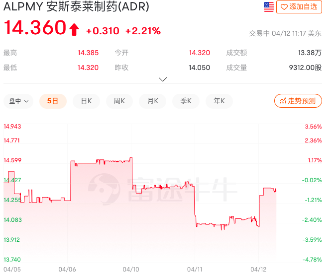 4月11日,安斯泰来股价下跌超2%,收盘价每股14.40美元。