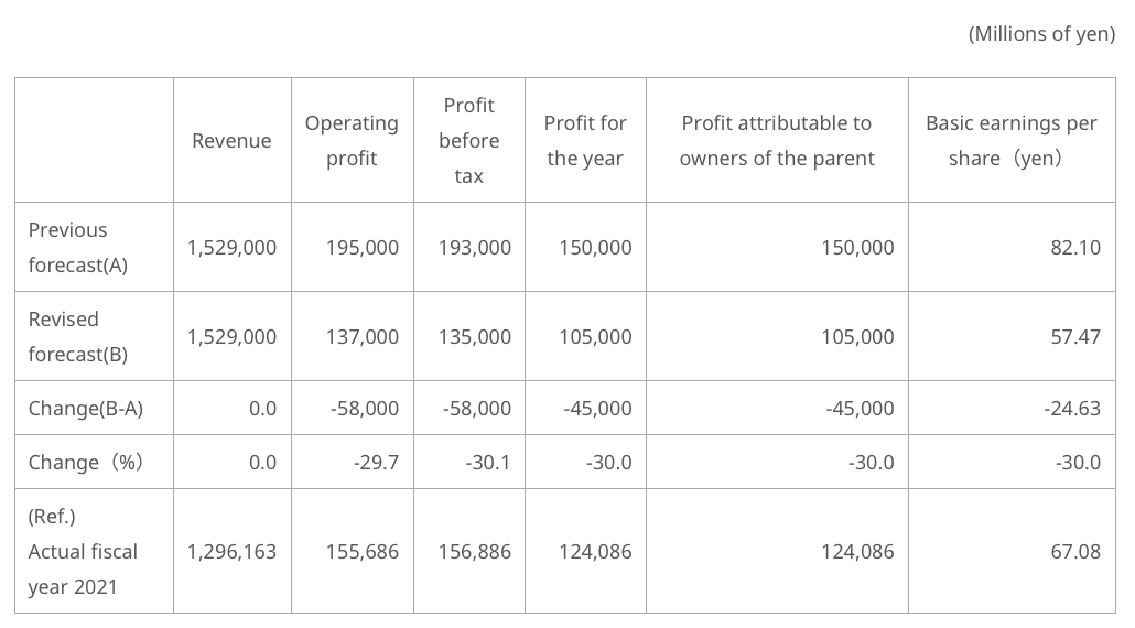 4月11日,安斯泰来宣布,预计将在2022财年第四季度计入约580亿日元(4.35亿美元)的减值损失作为其他支出。因此,2023年2月6日公布的2022财年财务预测修订如下。