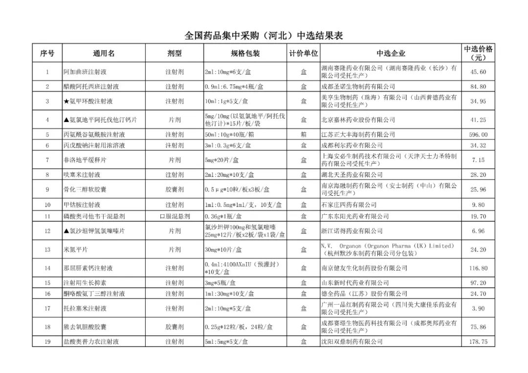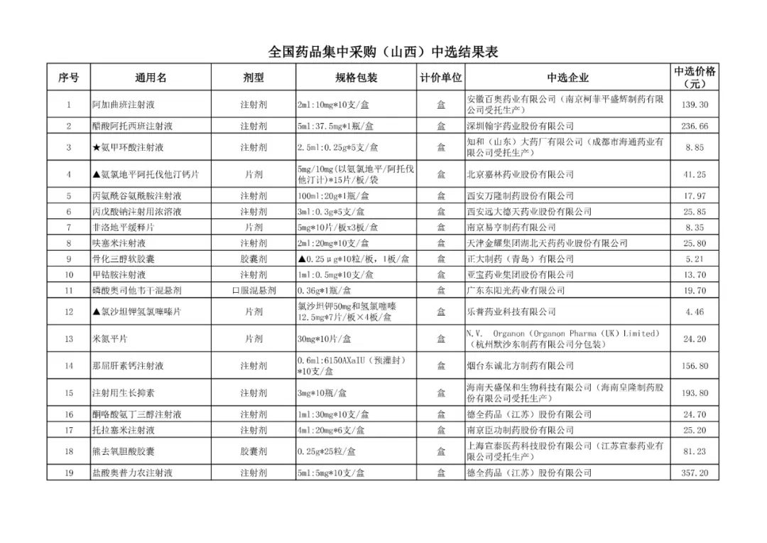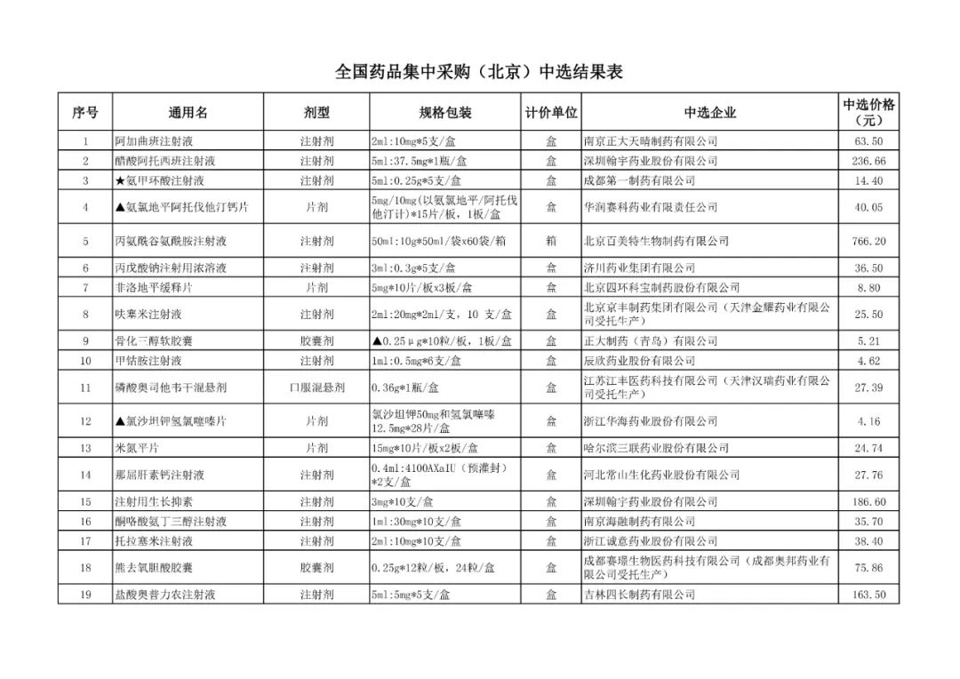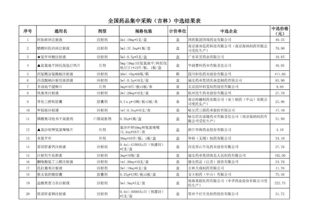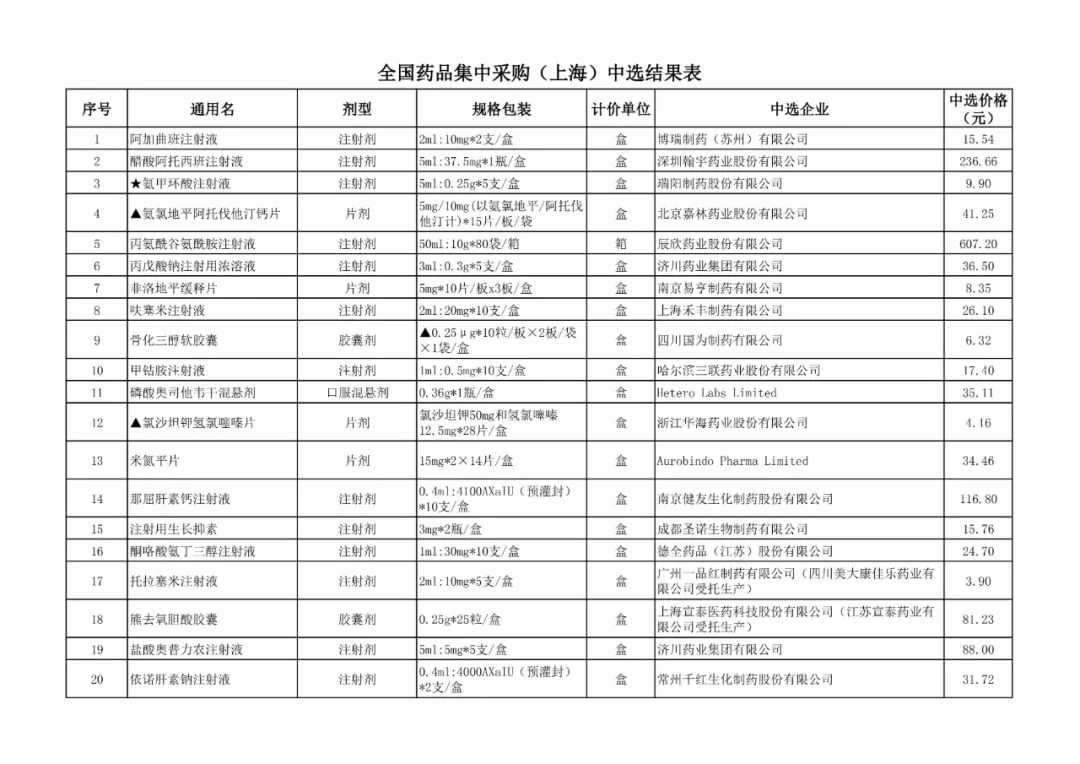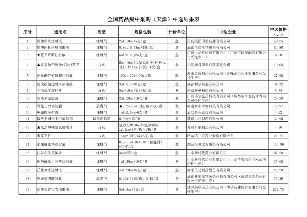 1、全国药品集中采购中选结果表