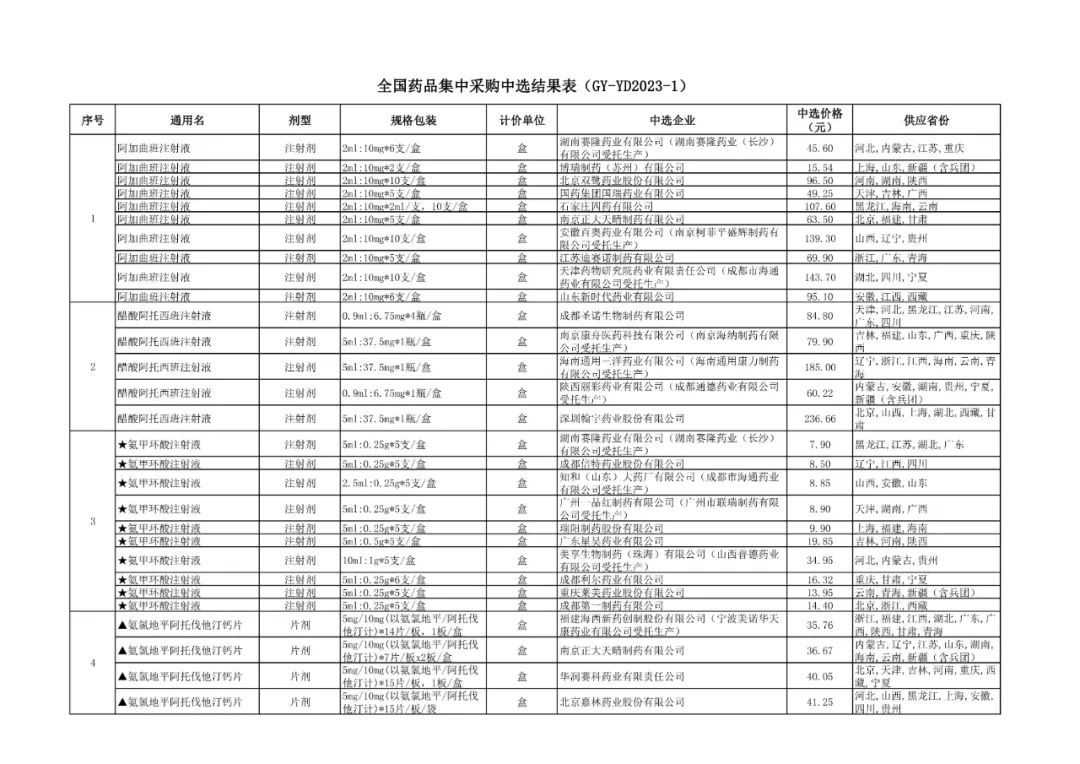 根据《全国药品集中采购文件(GY-YD2023-1)》(以下简称“采购文件”)规定,联合采购办公室开展了药品集中采购工作,现公布中选结果(详见附件)。本次集采中选结果将于2023年7月实施,具体执行日期以各地发布通知为准。中选结果公布后,如经调查发现中选企业存在违法违规的情况,将按照采购文件有关条款予以处理。