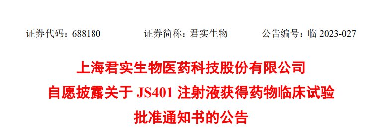 近日,上海君实生物医药科技股份有限公司(以下简称“公司”)与控股子公司无锡润民医药科技有限公司(以下简称“无锡润民”)收到国家药品监督管理局核准签发的《药物临床试验批准通知书》,ANGPTL3 siRNA药物JS401注射液(项目代号“JS401”)的临床试验申请获得批准。为该同类靶点siRNA药物中国内首款获批临床。