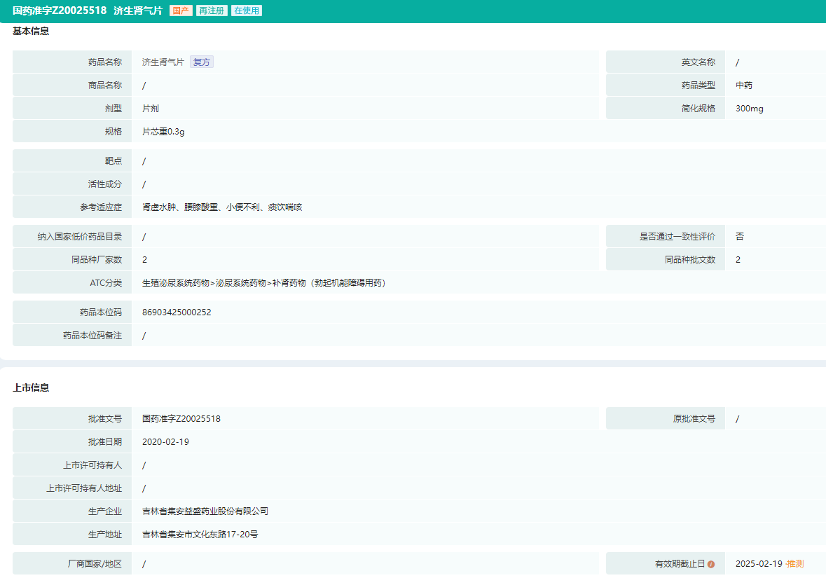 济生肾气片-生产批文基本信息查询(部分)