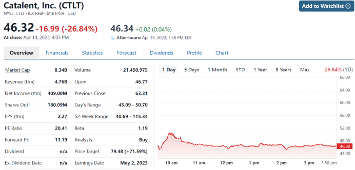 4月14日,全球CDMO龙头,Catalent公司警告称,其三家主要制造工厂(包括一家生产基因疗法的工厂)的生产力问题和高于预期的成本,预计将影响2023财年业绩;公司的首席财务官已辞职,受到利空影响,Catalent股价周五收盘下跌超过20%,市值蒸发约30亿美元。