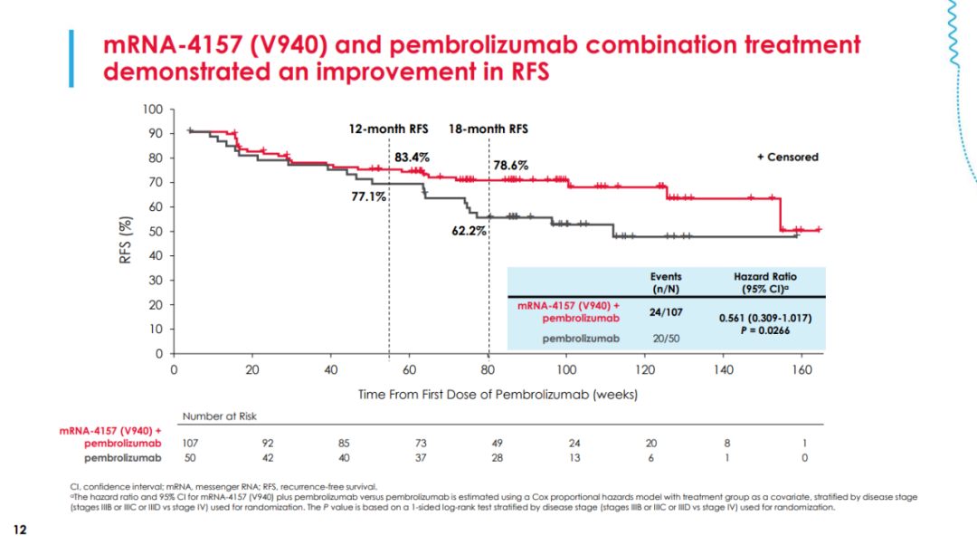 本次AACR大会上公布的最新数据显示,mRNA-4157+Keytruda联合治疗组中有22.4%的患者(n=24/107)报告复发或死亡,而接受Keytruda单药治疗的患者有40%(n=20/50)报告复发或死亡,中位随访时间分别为23和24个月。