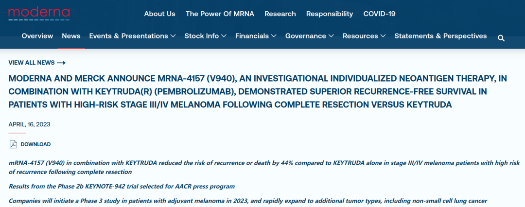 2023年2月23日,mRNA-4157+Keytruda联合疗法已获得了美国FDA的突破性疗法,用于高风险黑色素肿瘤患者接受完全切除术后的辅助治疗。
