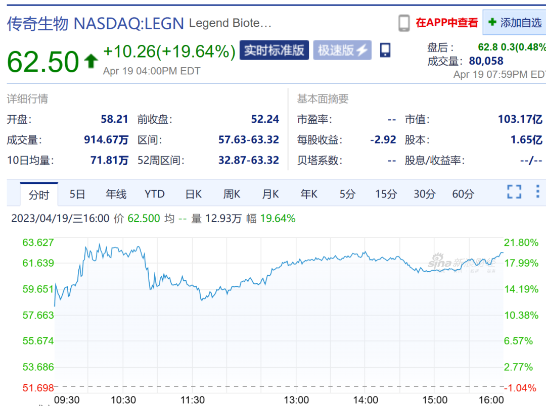 受此影响,截至4月19日收盘,传奇生物的股价暴涨近20%,市值再创新高,突破100亿美元。