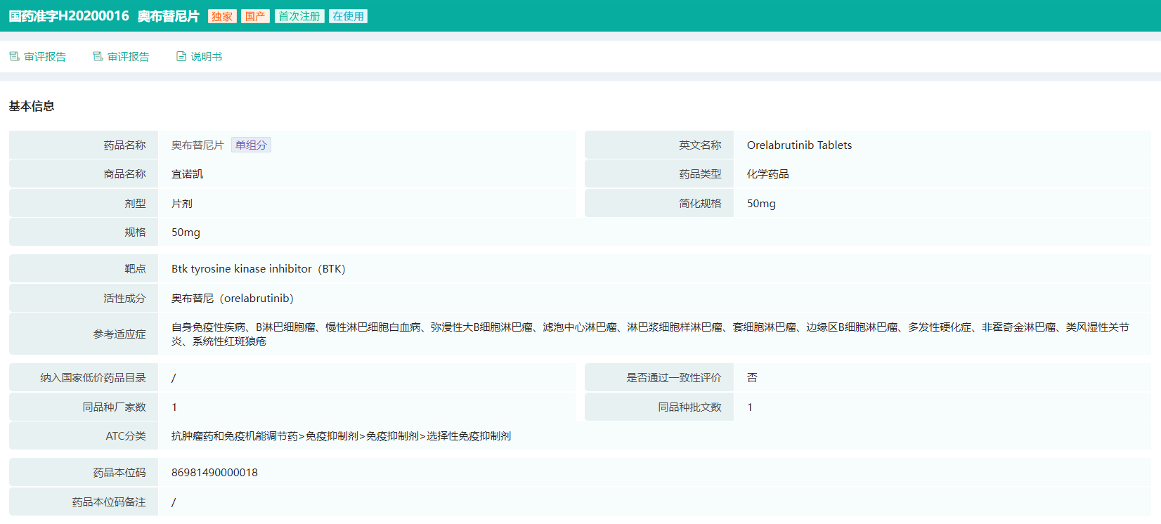 据药融云数据库显示,奥布替尼是诺诚健华研发的1类新药,是具高度选择性的新型BTK抑制剂(布鲁顿酪氨酸激酶),旨在用于治疗血液肿瘤及自身免疫性疾病。该药最早于2020年12月25日在中国附条件获批用于治疗复发/难治性慢性淋巴细胞白血病(CLL)/小淋巴细胞淋巴瘤(SLL)、以及复发/难治性套细胞淋巴瘤(MCL)2项适应症。2021年底,奥布替尼被纳入国家医保以惠及更多患者。