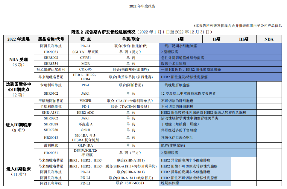 恒瑞医药2022年财报期内,公司共有6项上市申请获 NMPA受理,2项临床达到国际多中心Ⅲ期主要研究终点,8项临床推进至Ⅲ期,11项临床推进至Ⅱ期,23项临床推进至Ⅰ期。