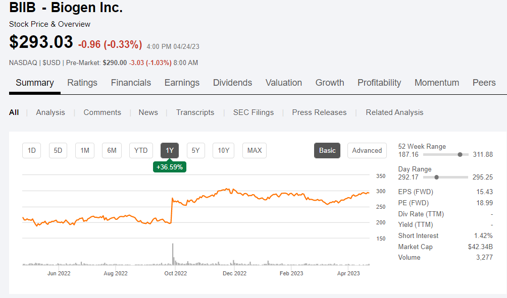 随着Q1财报揭露,Biogen股价轻微浮动,目前市值为423.4亿美元,折合人民币2930亿元。