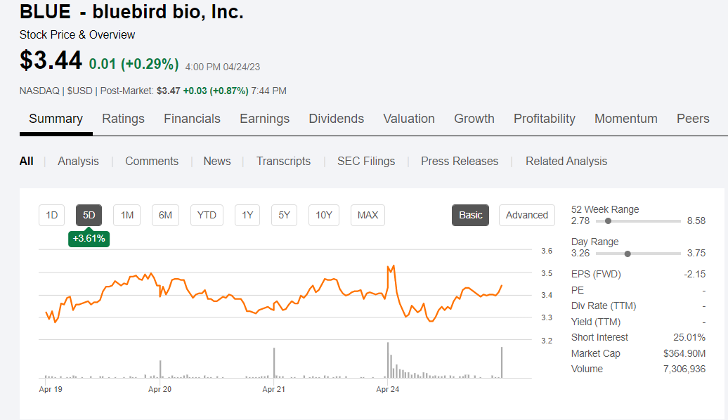 最初,蓝鸟生物期望在2023年第一季度末之前向FDA提交BLA,但是3月底时,这一目标没有实现,并且蓝鸟生物当时还推迟了lovo-cel的BLA申请,导致其股价大跌31%。