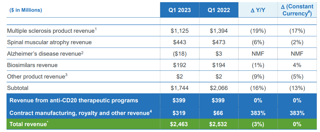 据Biogen2023年Q1财报显示,公司目前面临着两大问题:其多发性硬化症特许经营权的收入下降,2023年Q1同比下降19%,以及有较大争议的阿尔茨海默病药物Aduhelm,2023年Q1亏损0.18亿美元。