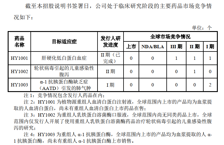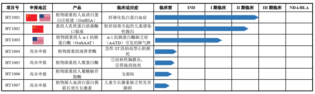 HY1002为重组人乳铁蛋白溶菌酶口服液,用于治疗轮状病毒引起的儿童感染性腹泻,目前处于国内II期临床试验阶段;HY1003为植物源重组人α-1抗胰蛋白酶,已经获得美国FDA孤儿药资格认定,正在美国开展I期临床试验。此外,禾元生物还有4个产品处于临床前研究阶段。