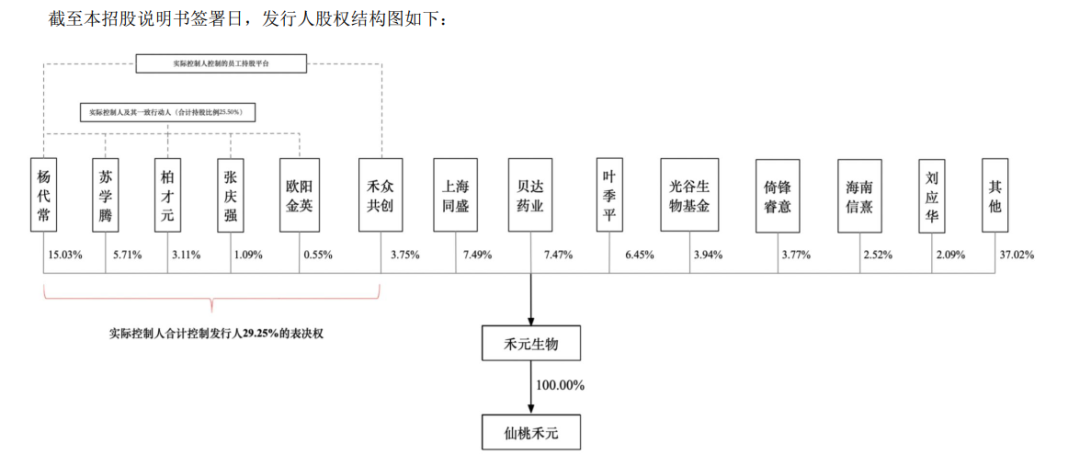 2022年2月,禾元生物完成Pre-IPO轮融资,获得5.56亿元资金,以增资价格及发行后总股数计算,该轮融资禾元生物的整体估值约为51.54亿元。禾元生物的创始人、实控人、研发带头人和核心技术人员,杨代常博士是禾元生物的灵魂人物。禾元生物经多次增资及股权转让后,截至上一版本招股书签署日(2022年12月22日),杨代常博士直接持股比例为15.03%,间接持股比例为3.75%,合计持股比例下降至18.78%。