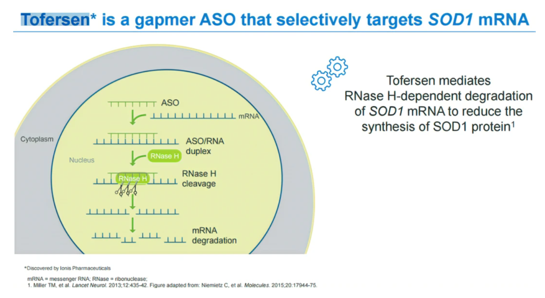 4月25日,Biogen(纳斯达克股票代码:BIIB)宣布,FDA已批准其反义寡核苷酸疗法QALSODY(tofersen)上市,用于治疗超氧化物歧化酶1 (SOD1)突变所致的肌萎缩侧索硬化(ALS)患者。这是首款针对ALS的基因靶向疗法(反义寡核苷酸疗法),由Biogen与Ionis合作开发。