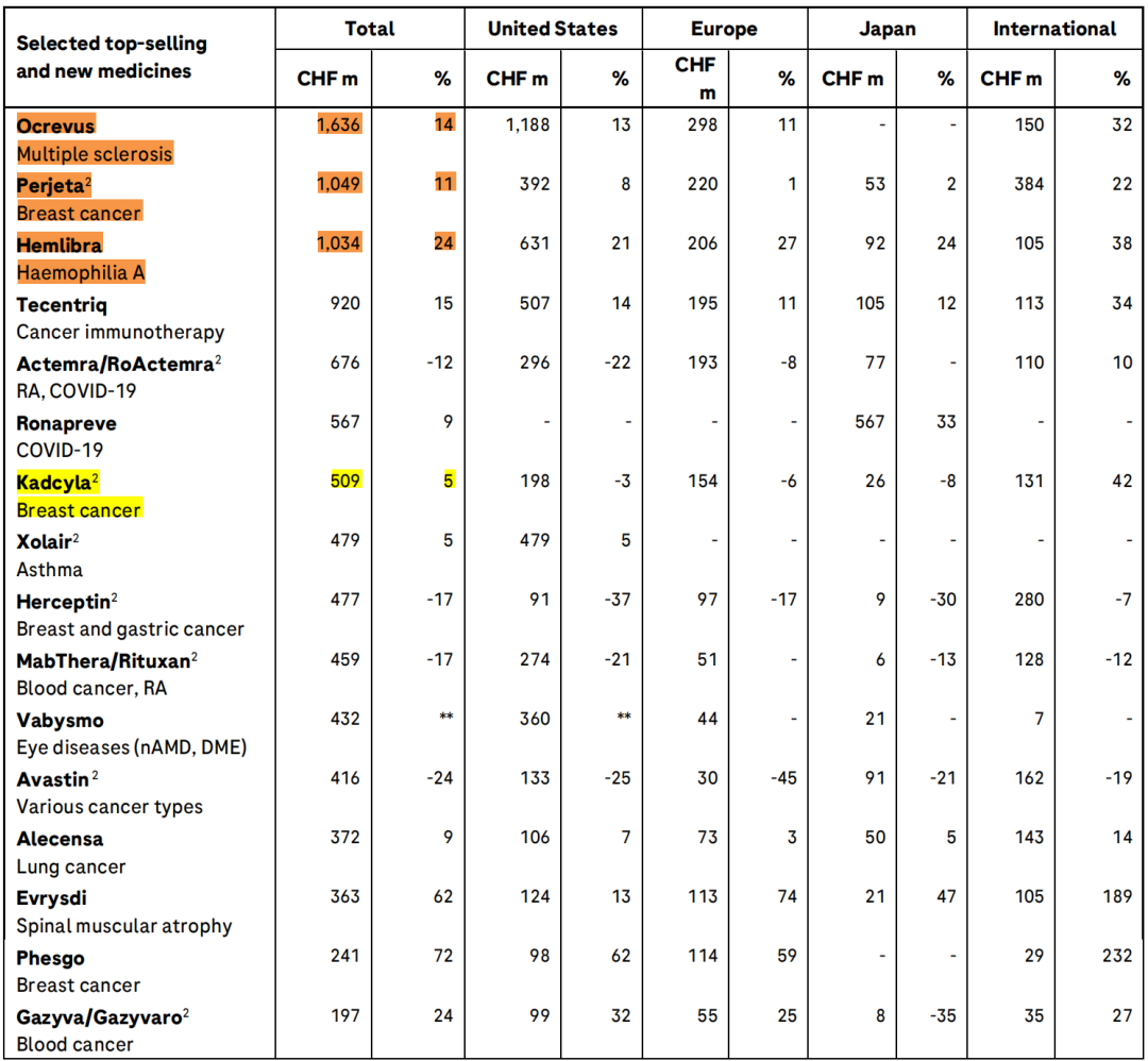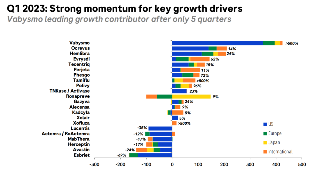 从销售额看来,罗氏2023年Q1财报中有三款药物营收超过10亿瑞士法郎,包括多发性硬化症药物Ocrevus(奥瑞珠单抗)、乳腺癌药物Perjeta(帕妥珠单抗)和血友病药物Hemlibra(艾美赛珠单抗)。