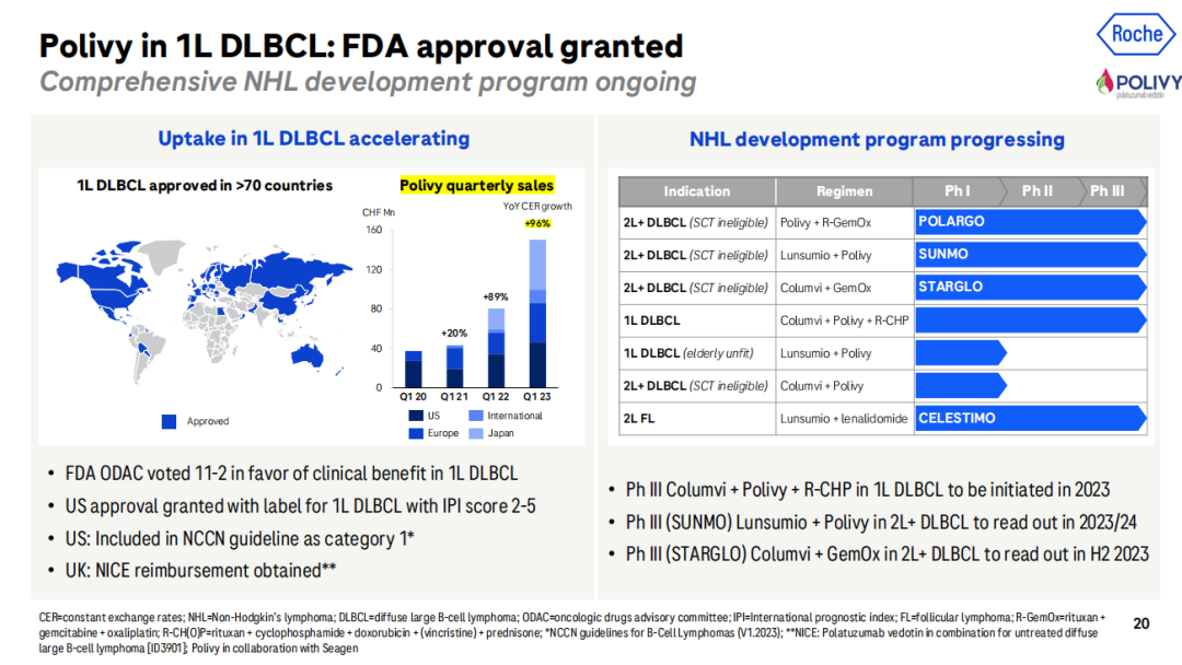 Polivy在今年Q1实现营收1.5亿瑞士法郎(约合1.68亿美元),同比增长96%。主要是由于Polivy分别于2022年8月和2023年1月,在日本和中国获批用于既往未经治疗的弥漫性大B细胞淋巴瘤成人患者,使得Polivy在日本和国际地区的销量大增。