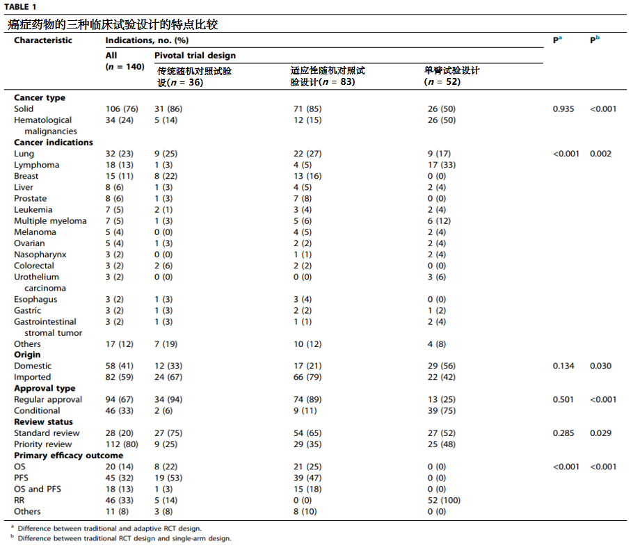 2.单臂试验设计特点与传统随机对照试验设计有很大差异,主要体现在癌症类型、适应症、新药来源、批准类型和审查状态。