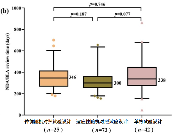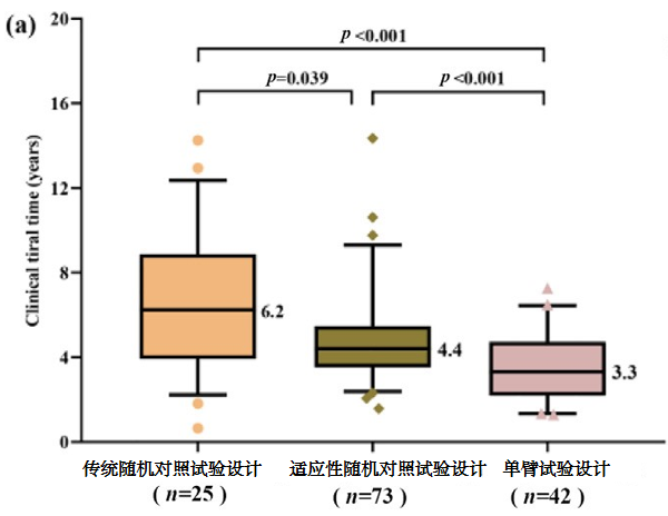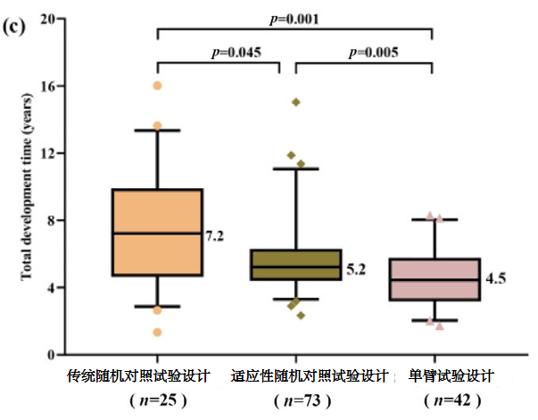 (临床试验时间中位数:3.3与6.2年,p<0.001,图2a;总药物开发时间中位数:4.5与7.2年,p=0.001,图2c)在新药申请/生物类似物申请时间方面,这些试验设计差异不显著(图2b)。