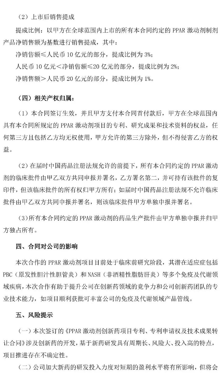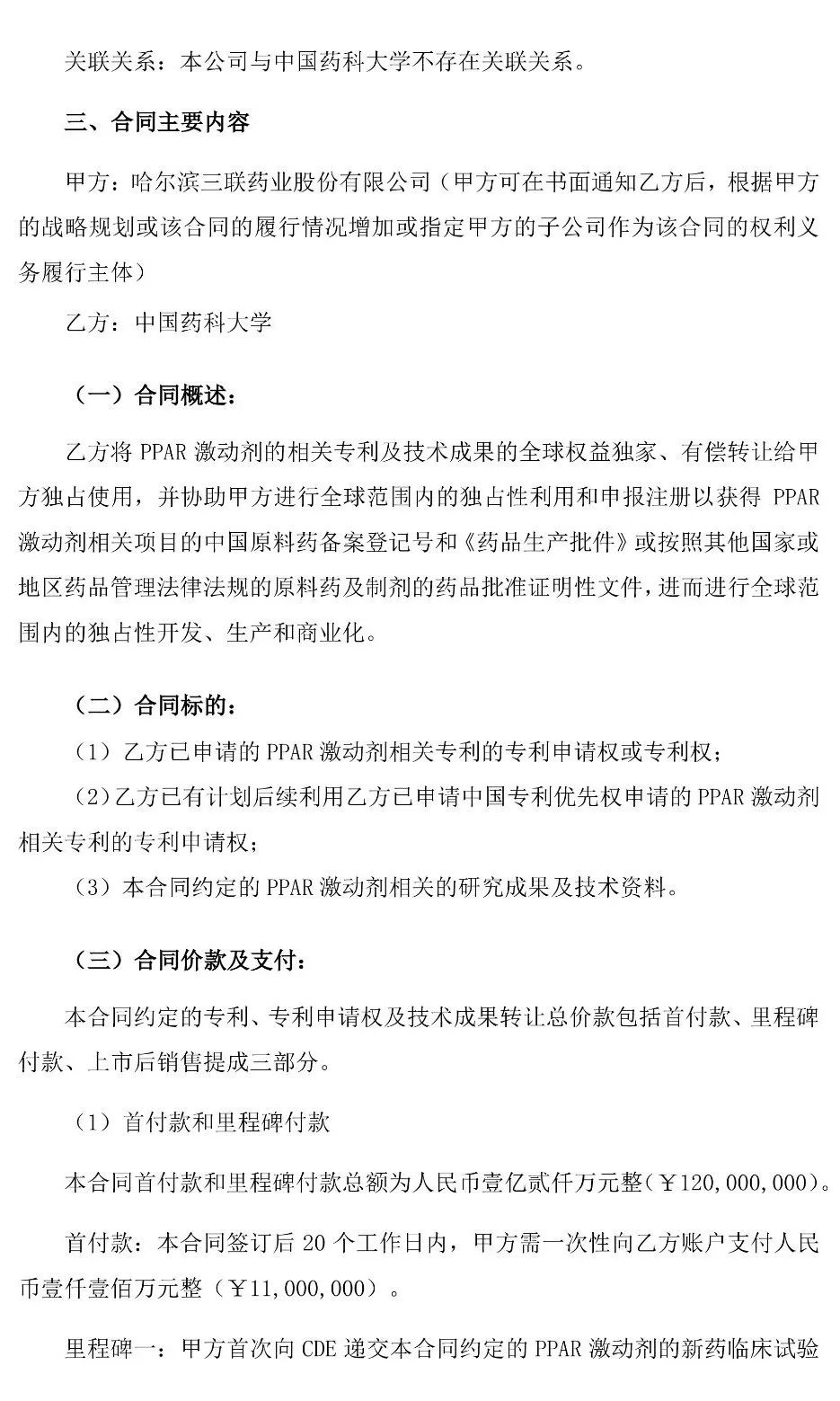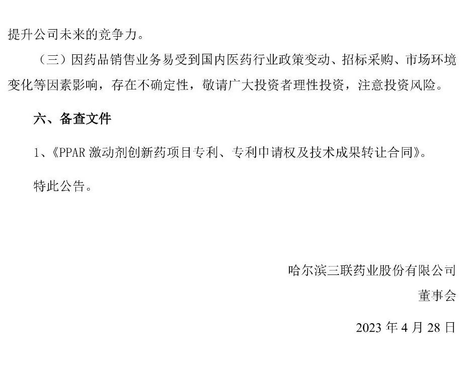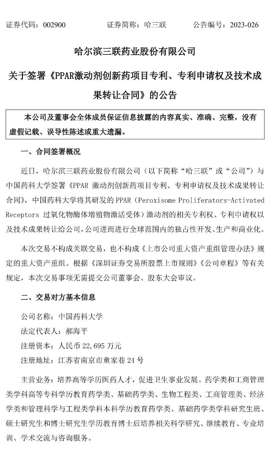 5月4日,哈尔滨三联药业股份有限公司(以下简称“哈三联”)发布公告,公司与中国药科大学签署《PPAR 激动剂创新药项目专利、专利申请权及技术成果转让合同》,中国药科大学将其研发的PPAR激动剂的相关专利权、专利申请权以及技术成果转让给哈三联,从而进行全球范围内的独占性开发、生产和商业化。