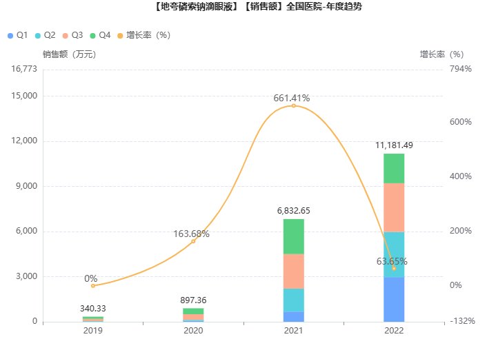 参天制药的地夸磷索钠滴眼液于2017年10月获批进口进入中国,国内商品名为丽爱思。近年来,该干眼症眼药水销售市场发展迅猛,2022年在全国院内同比增长64%,顺利突破亿元大关,跻身滴眼液TOP9品种(按品种名统计)。