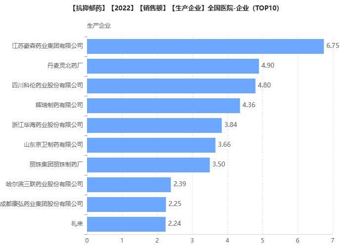 院内抗抑郁药TOP10药企(不含中成药)