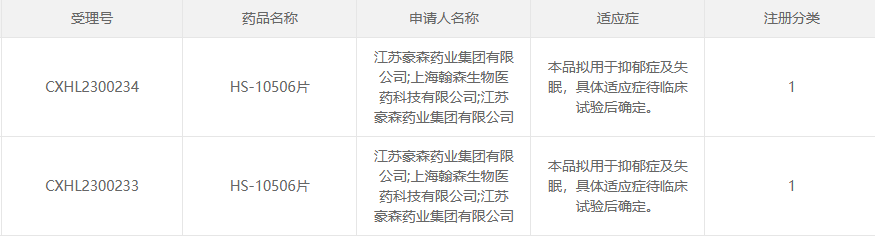 5月4日,CDE官网显示,江苏豪森药业集团旗下抗抑郁新药——HS-10506片首次作为1类新药获批临床(默示许可),拟用于抑郁症及失眠。据药融云数据库显示,在我国院内60亿+抗抑郁药市场中,豪森药业凭借其优势仿制药品种独占鳌头,公司还在持续布局抗抑郁新药,至此已有2款在研,不断加码市场。
