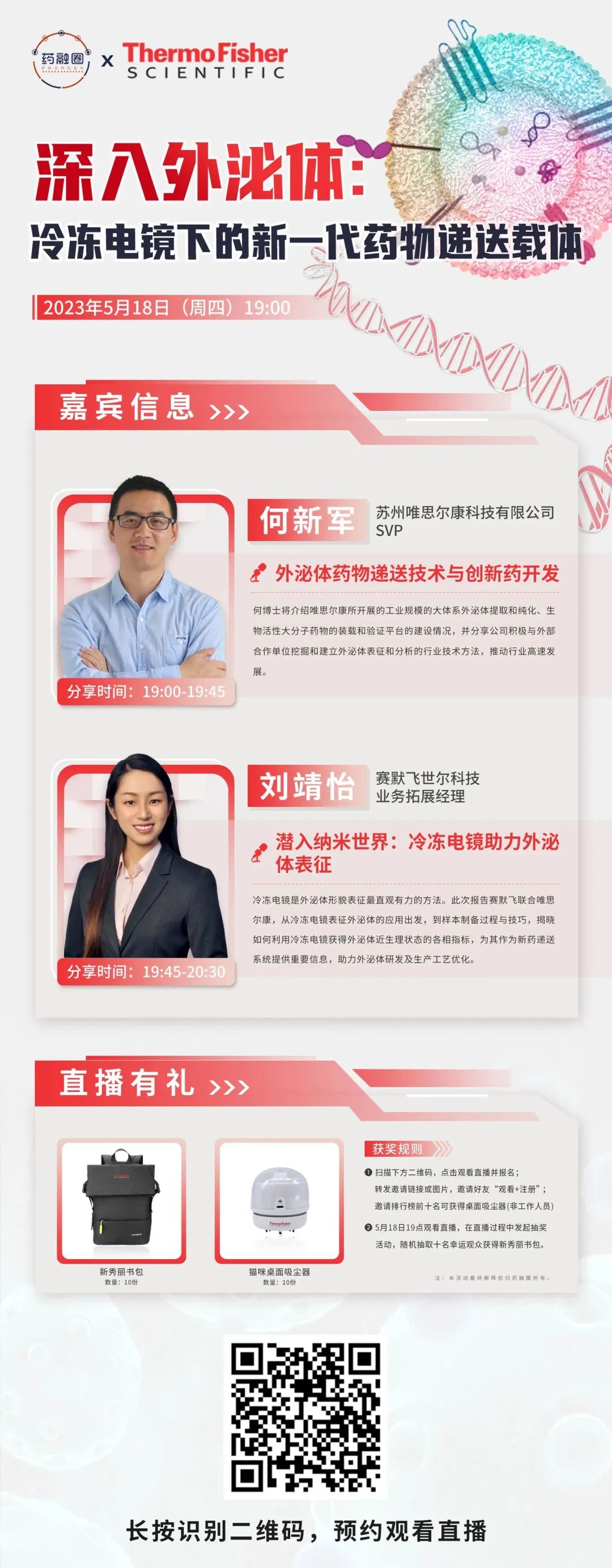 随着冷冻电镜技术的不断发展,已经突破分辨率极限,达到原子级别。冷冻电镜技术对外泌体的探究越来越细致,为了更深入地走进外泌体,了解冷冻电镜下的新一代药物递送载体,药融圈联合赛默飞共同邀请到苏州唯思尔康科技有限公司SVP何新军以及赛默飞世尔科技材料与结构分析业务拓展经理刘靖怡二位行业专家,于2023年5月18日做客线上直播间,揭开外泌体的神秘面纱。
