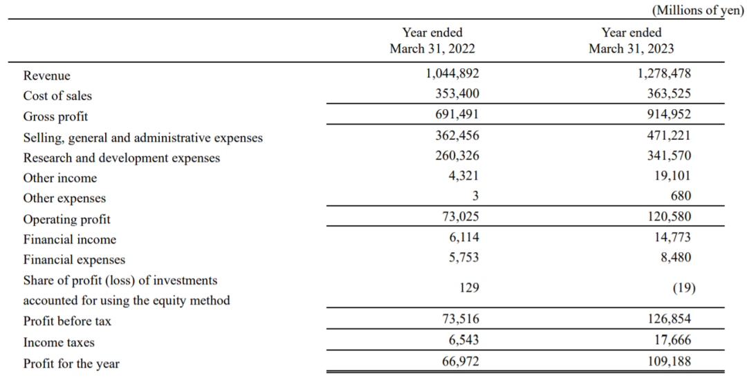 近日,日本制药巨头第一三共2022年财报发布(2022年4月1日-2023年3月31日),总营收12785亿日元(约合94.39亿美元),同比增长22.4%。销售费用3491亿日元,几乎与去年持平,毛利水平为72.69%,相较去年同期有明显提升。销售和管理费用支出4701亿日元,同比增长33.5%至总销售额的26.34%。研发投入3367亿日元(约合24.86亿美元),相比去年同期增长了32.5%,研发投入水平升高至销售额的26.34%,在制药巨头中已经属于非常高的水准。