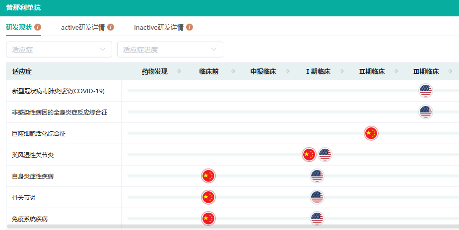 在国内,普那利单抗最高已研发至临床II期阶段,为评价普那利单抗治疗风湿免疫性疾病相关噬血细胞性淋巴组织细胞增多症受试者的临床研究。