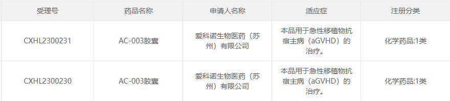 本次AC-003胶囊获批临床(默示许可),用于急性移植物抗宿主病(aGVHD)的治疗。去年8月,该1类新药还获CDE临床默示许可,用于特发性肺纤维化(IPF)的治疗,目前该适应症正在开展I期临床。
