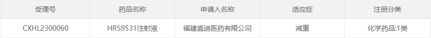 据药融云数据库显示,HRS9531注射液此次的国内化药临床申请于2023年1月11日获药审中心承办,受理号为CXHL2300060—HRS9531,到获批临床,全程共用时114天。