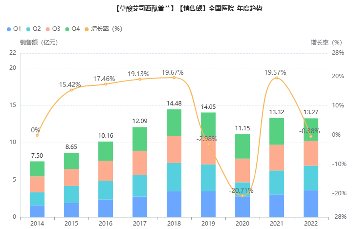 2022年底,成都康弘药业的草酸艾司西酞普兰口服溶液获批上市,视同通过一致性评价,拿下该TOP1抗抑郁药的国内首仿药+首家过评。本次浙江国镜药业再次通过一致性评价,为该品种国内第2家获得批文的药企,另有太阳升医药递交上市申请,现在审评审批中。