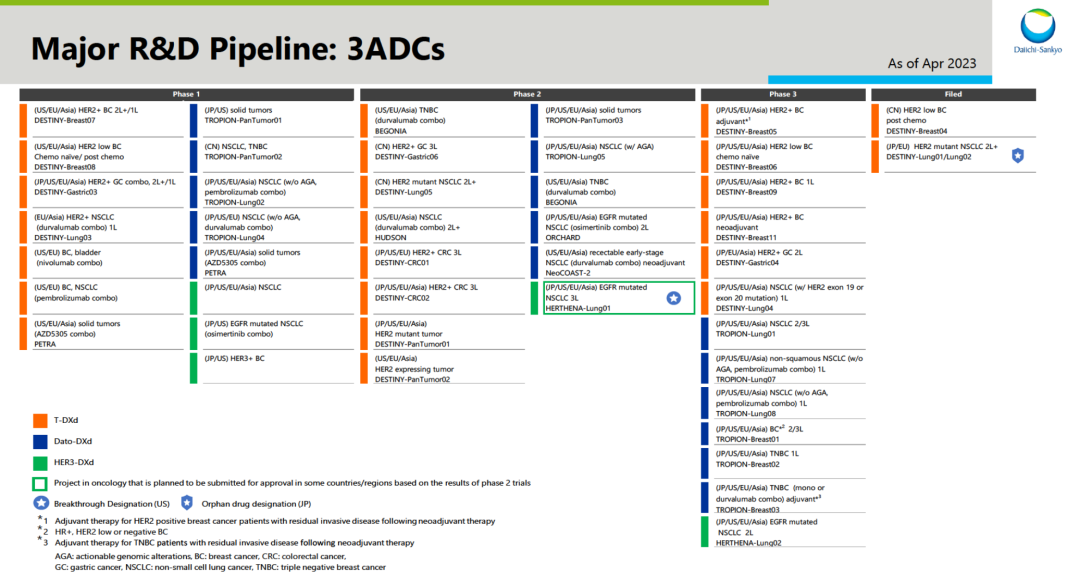 除Enhertu外,第一三共还有2款重磅ADC药物Dato-DXd和HER3-DXd均已进入3期临床阶段。