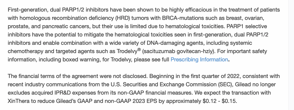 药融圈获悉:2023年5月9日,由华人科学家创立的Biotech公司——XinThera Pharmaceuticals, Inc.(以下简称“XinThera”)被吉利德科学(纳斯达克股票代码:GILD)成功收购。通过此次收购,吉利德获得了针对肿瘤治疗的PARP1小分子抑制剂和炎症性疾病治疗的MK2小分子抑制剂,这些产品管线将于今年底前进入临床试验阶段。