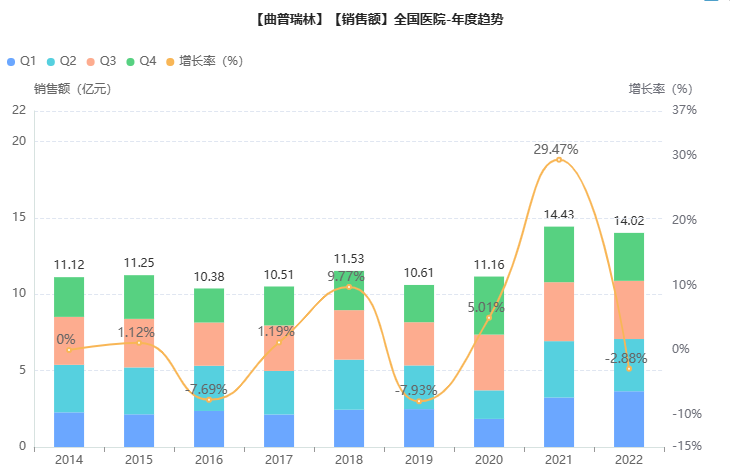 曲普瑞林是天然促性腺激素释放激素(GnRH)的类似物,国内有醋酸曲普瑞林注射液、注射用曲普瑞林、注射用双羟萘酸曲普瑞林等制剂获批上市,均已纳入医保(乙类)。据药融云数据库,近两年曲普瑞林相关制剂院内市场均在14亿以上,法国益普生、辉凌医药市场优势较大。