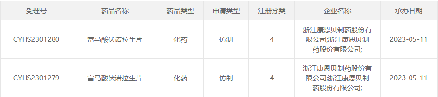 以仿制4类报产富马酸伏诺拉生片的在审企业(截至2023.05.10)