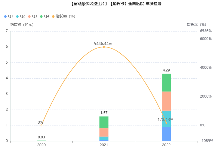 富马酸伏诺拉生片目前在我国还处于前期扩张模式,据药融云统计,2021年该药院内销售额大涨,一举破亿。2022年又同比增长了173%,销售额达到4.29亿,上升趋势明显,前景可观。由于国产仿制药获批较晚,目前该P-CAB抑酸药市场由武田制药一家独享。