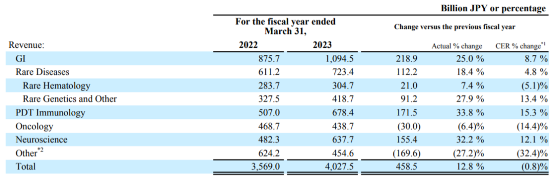 除以上五大领域外的其他领域的药物营收4546亿日元,同比下降27.2%。
