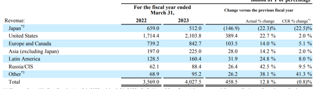 据武田2022年业绩,日本业务营收5120亿日元,同比下降22.3%,美国业务营收21038亿日元,同比增长22.7%,欧洲和加拿大业务营收8427亿日元,同比14.0%,亚洲业务( 除日本)营收2250亿日元,同比增长14.2%,拉丁美洲业务营收1604亿日元,同比增长24.8%,俄罗斯业务营收884亿日元,同比增长42.5%,其他地区营收952亿日元,同比增长38.1%。整体而言,除日本以外,其他区域都出现了不同程度的增长,原因除了产品外,日元贬值的原因也不可忽略。虽然武田销售额实现了12.8%的增长,但用固定汇率来计算,反而萎缩了0.8%。
