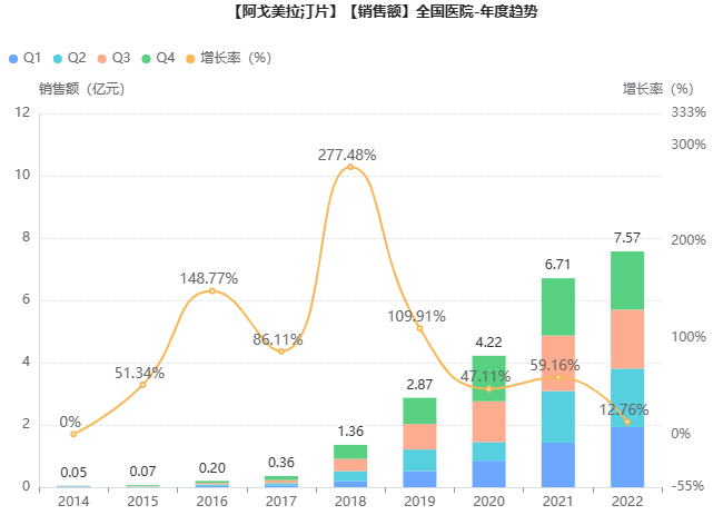 近日,北京福元医药递交的4类化药阿戈美拉汀片仿制药上市申请获CDE受理,该品种的国产第二家争夺战就此打响。据药融云数据库,该抑郁药2022年院内畅销7.6亿,排名抗抑郁药TOP2。豪森药业是目前唯一一家获批生产销售该药的本土药企,市场碾压原研。