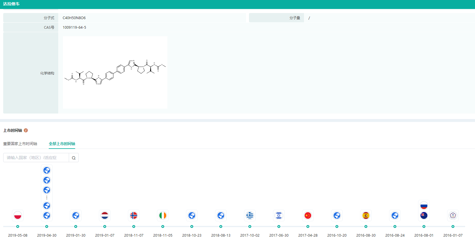药融云数据库显示,达拉他韦是全球首个获批上市的NS5A复制复合体抑制剂,由百时美施贵宝公司研发,于2014年7月获日本PMDA批准上市,于2015年7月获得美国FDA批准上市,商品名Daklinza®;后又于2017年4月在中国获批上市。