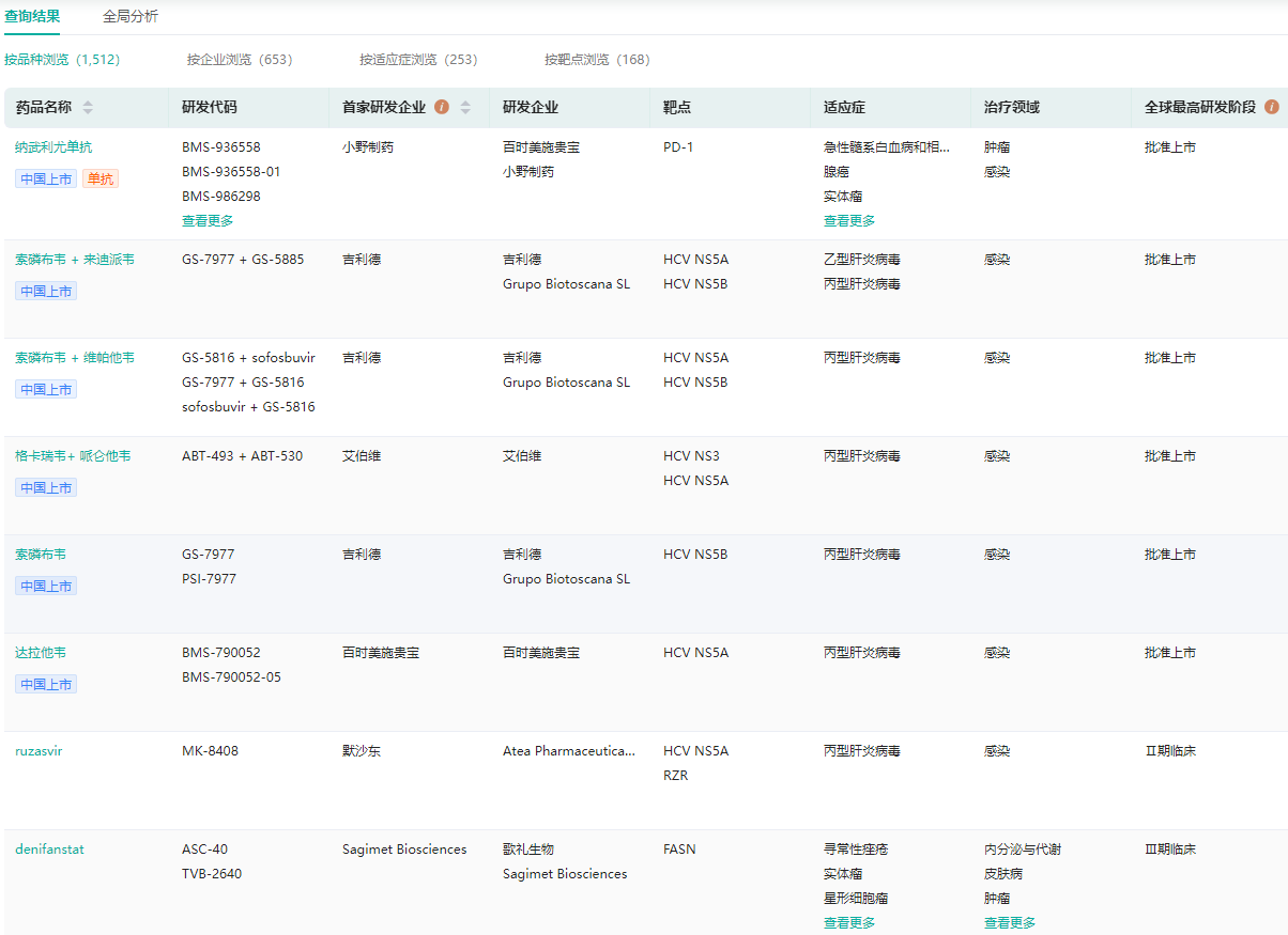 丙型肝炎全球药物研发进展查询(部分,完整内容请登录“药融云数据库www.pharnexcloud.com/?mh”查看)