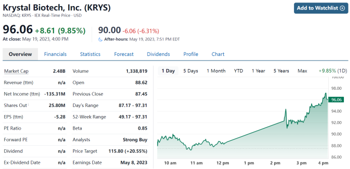 受到该外用基因疗法获批影响,Krystal Biotech股价瞬间拉升10%,目前市值25亿美元左右。今年Q1公司研发费用支出1228万美元,截止一季度公司在手现金及等价物1.4亿美元。