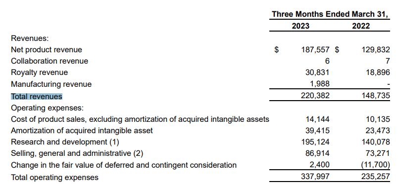 近日,PTC Therapeutics发布2023年一季报,报告显示:公司总营收2.2亿美元,同比增长48%;其中产品收入1.88亿美元,同比增长45%;研发费用支出1.95亿美元,同比增长39%。