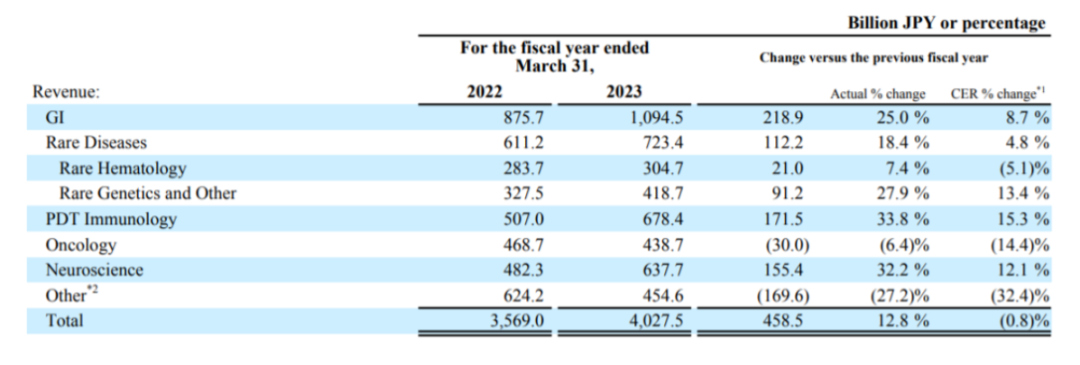 据武田2023年财报,公司收入主要来源于5大板块:消化道产品管线、罕见病治疗管线、血浆制品管线、精神疾病治疗领域和抗肿瘤管线。其中,消化道产品管线是最主要来源,全年收入10945亿日元,同比增长25%,Entyvio(维多珠单抗)是武田在该治疗管线的顶梁柱,单品销售额达7027亿日元(52.05亿美元),同比增长34.7%。