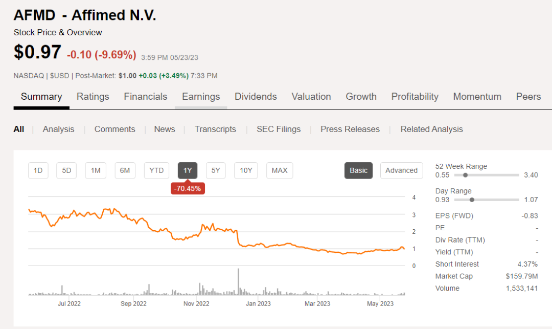 过去一年,在生物技术市场整体低迷的背景下,Affimed的股价下跌了70%以上,每股股价低于1美元。目前,Affimed市值为1.579亿美元。