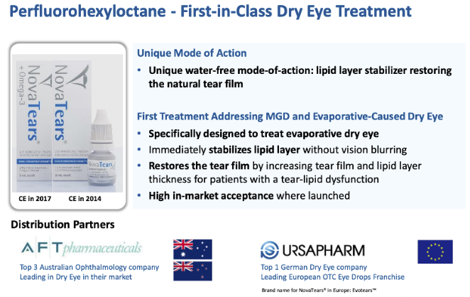 全氟己基辛烷滴眼液,采用专有无水药物递送技术EyeSol开发。本干眼症新药是一种澄清透明、无色、无颗粒、几乎无气味的无菌滴眼液。相关专利:WO-2017055453。